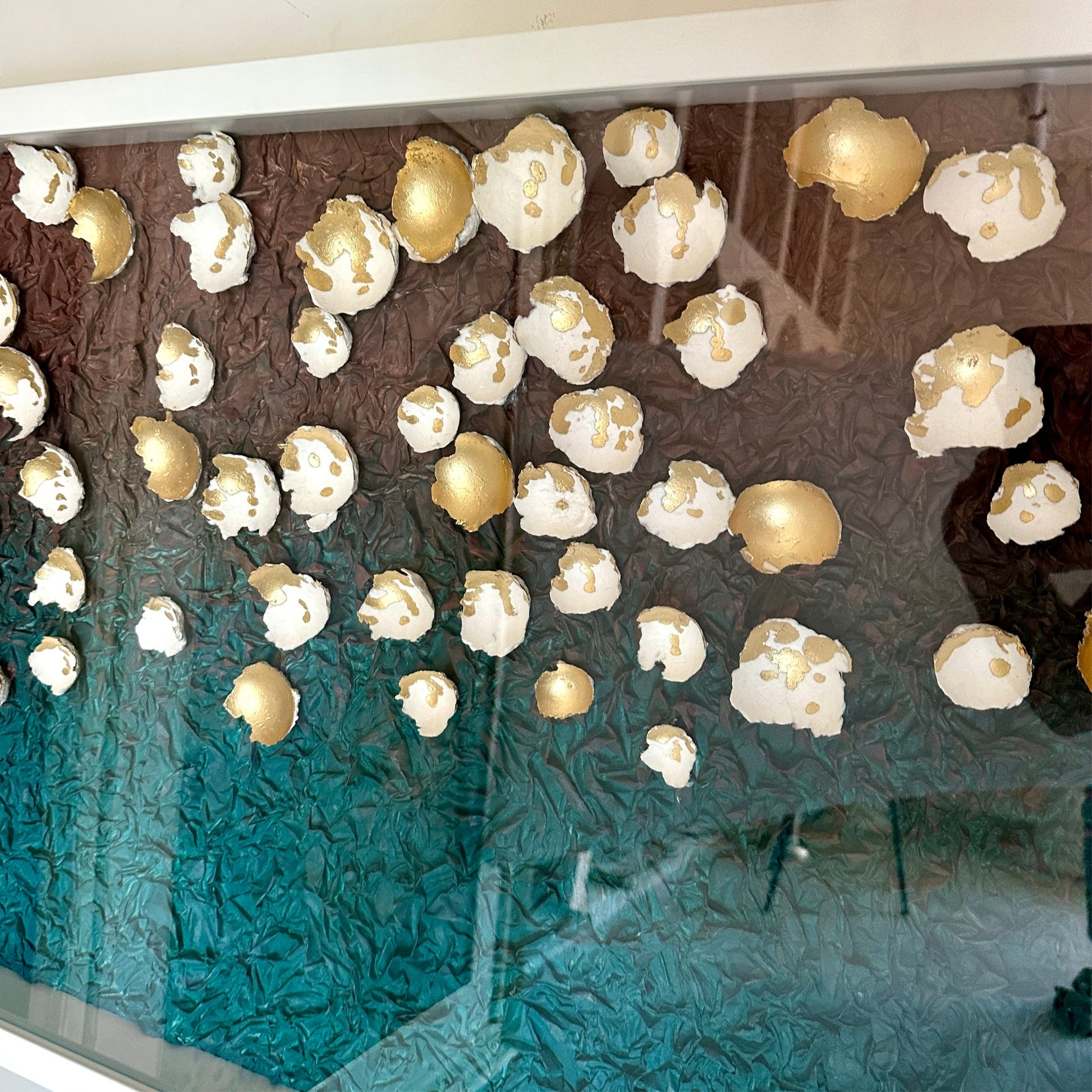 Material: Intricate paper art enclosed enclosed in acrylic glass in a white wooden frame.