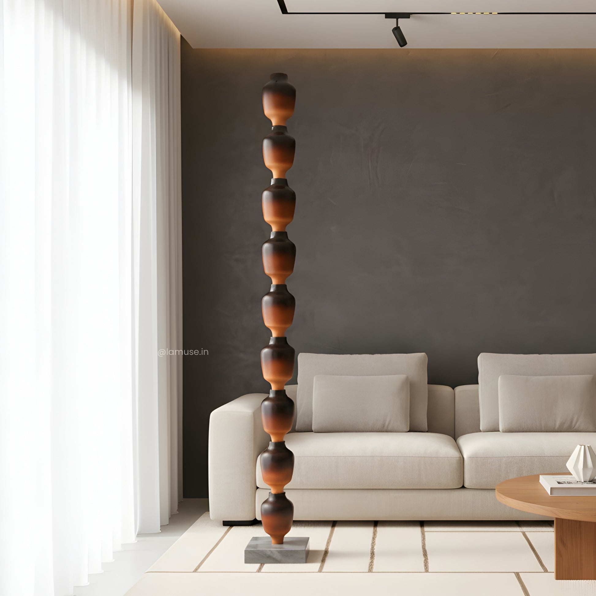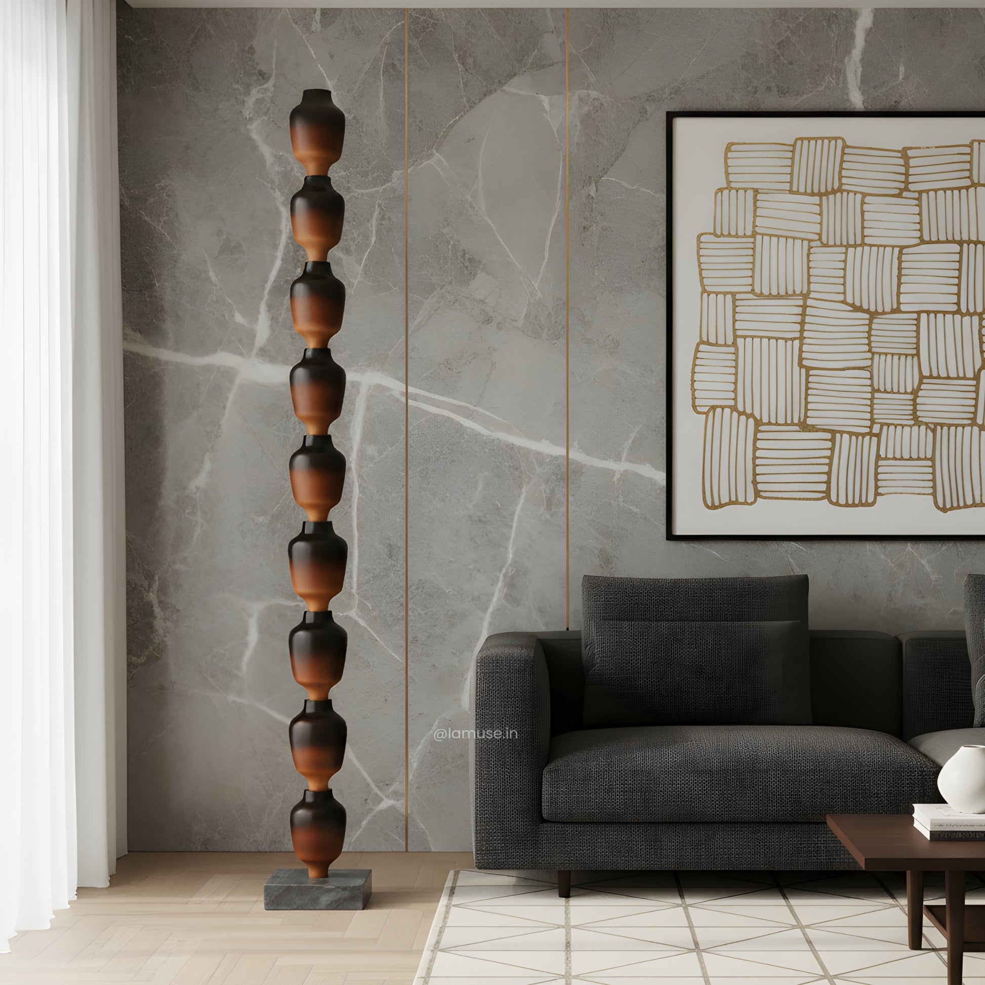 Material: Crafted with a marble base and a metal–wood structure with wooden finish — a study in balance, texture, and enduring form.