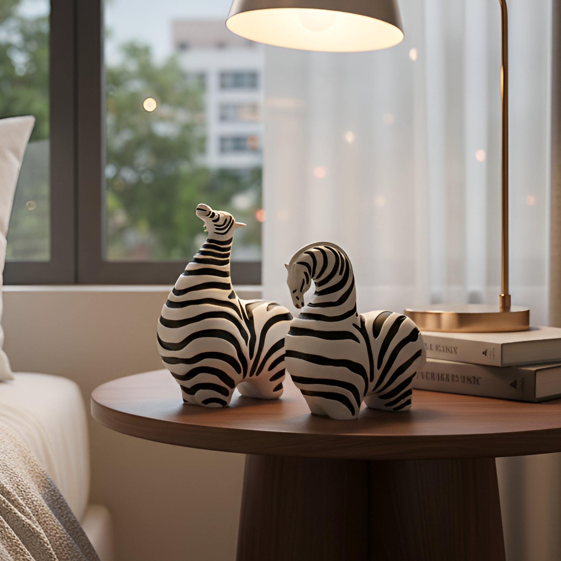 Style it on a marble console, a bookshelf, or a softly lit lounge ledge. Its sculptural zebra form and fluid striped detailing introduce rhythm and contrast, creating a composed focal point that feels intentional and quietly distinctive.