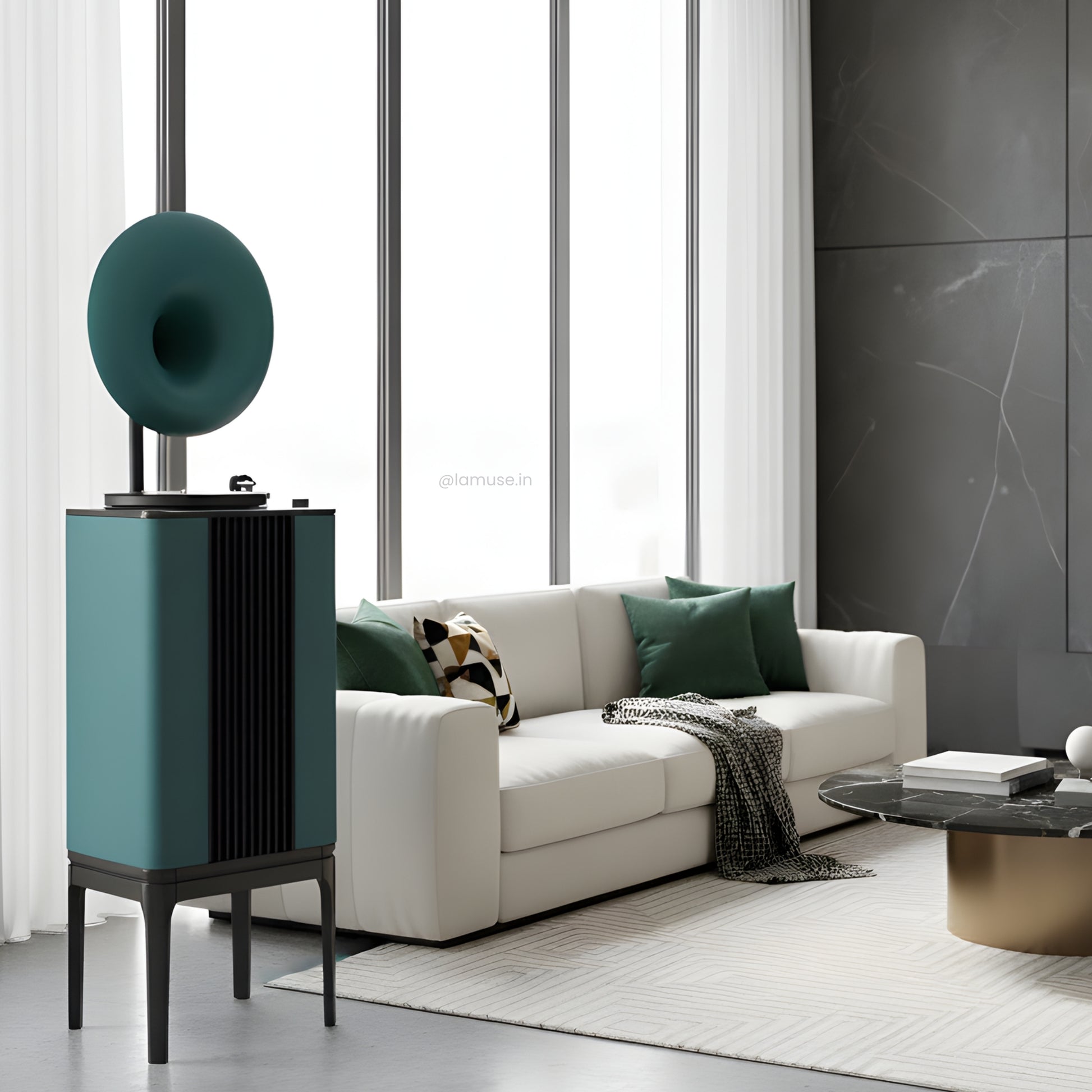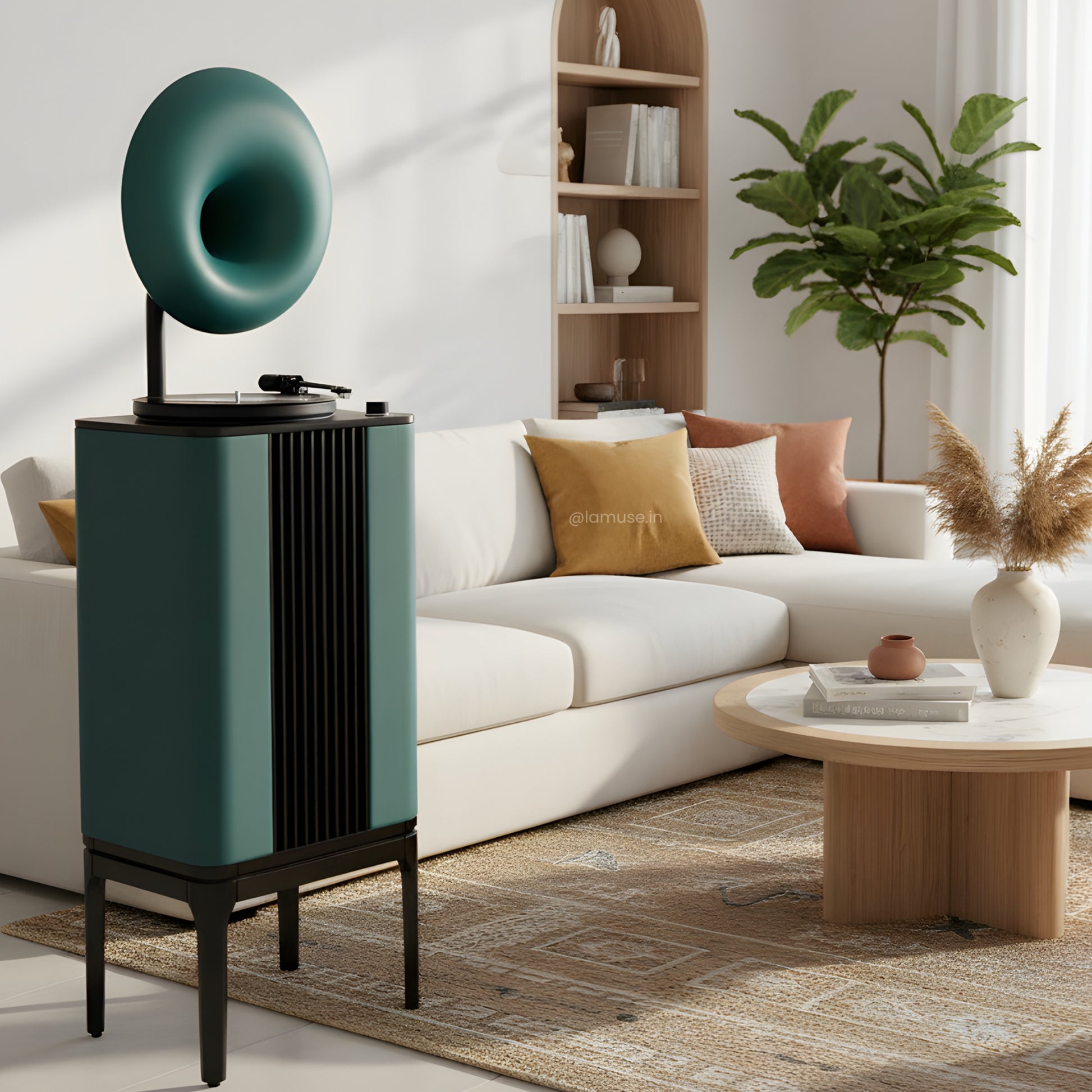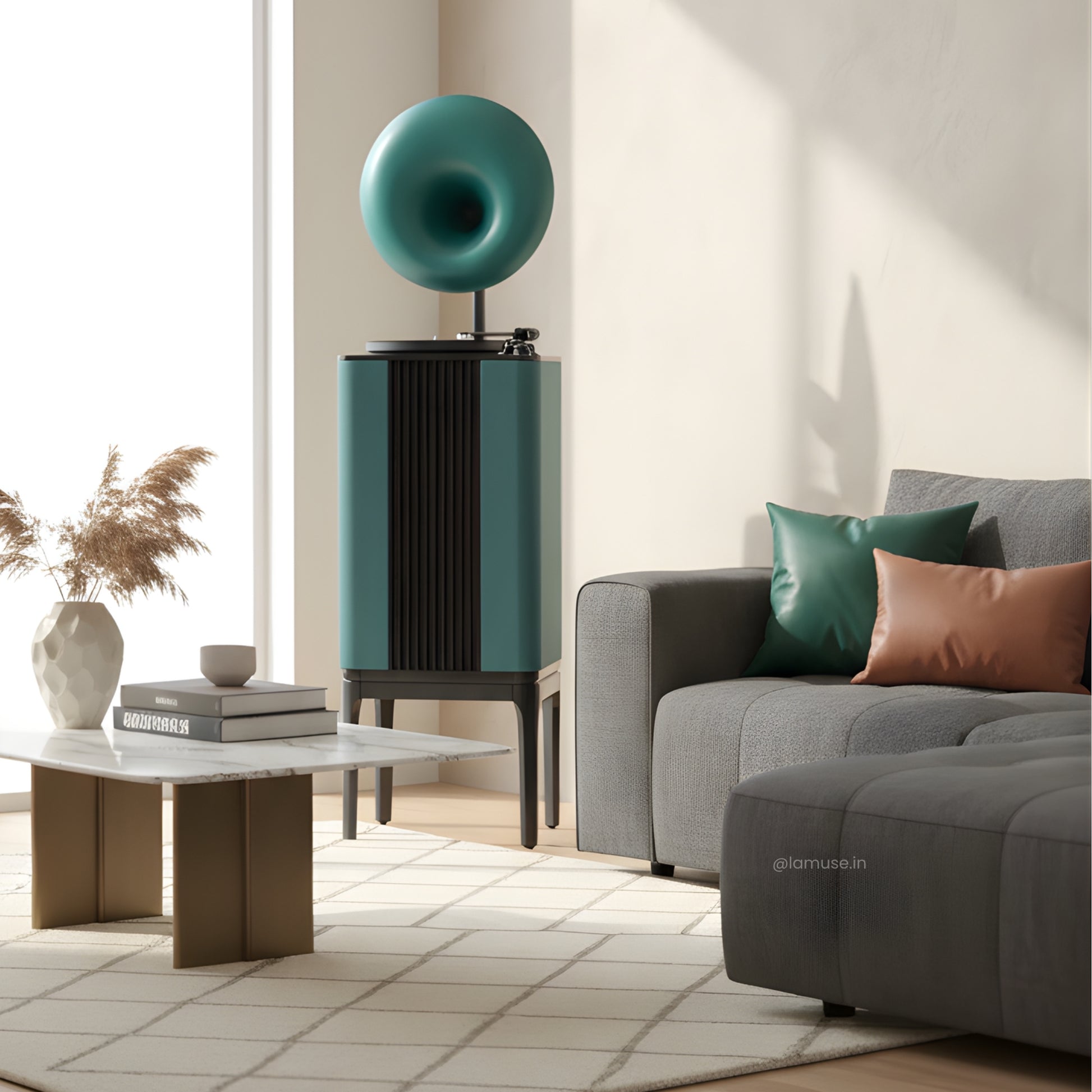 This working gramophone is a conversation between eras — Designed for those who see nostalgia not as the past, but as permanence, Symphony transforms music into an atmosphere — sculptural, soulful, and deeply human.