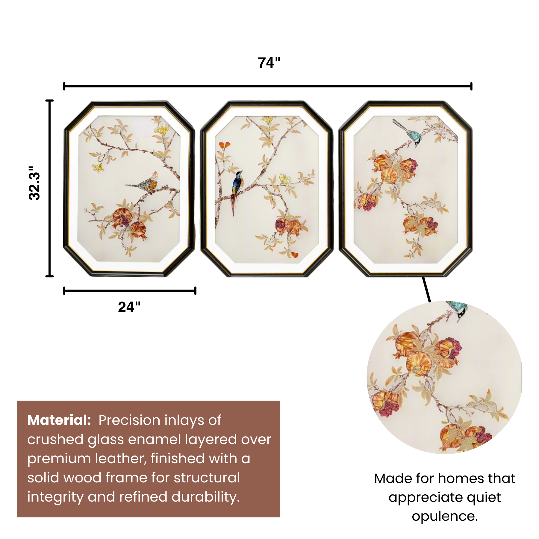 Material: Precision inlays of crushed glass enamel layered over premium leather, finished with a solid wood frame for structural integrity and refined durability.