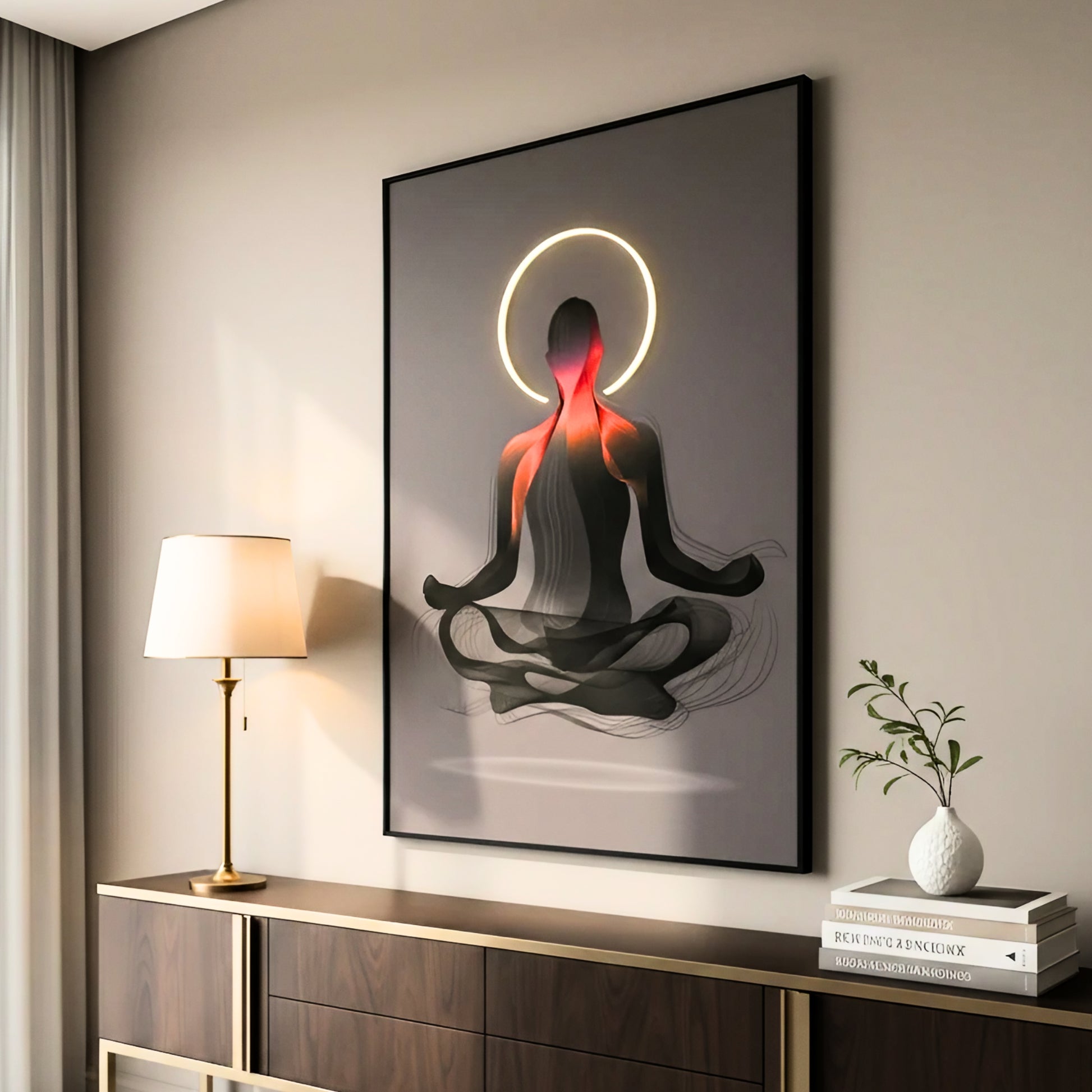 Place it above a console where mornings unfold with intention, within a study that nurtures clarity, or in a reading nook where reflection lingers in the evening light. Zen shapes the ambience with depth and composure, cultivating a space where presence feels heightened and awareness unfolds gently into insight.